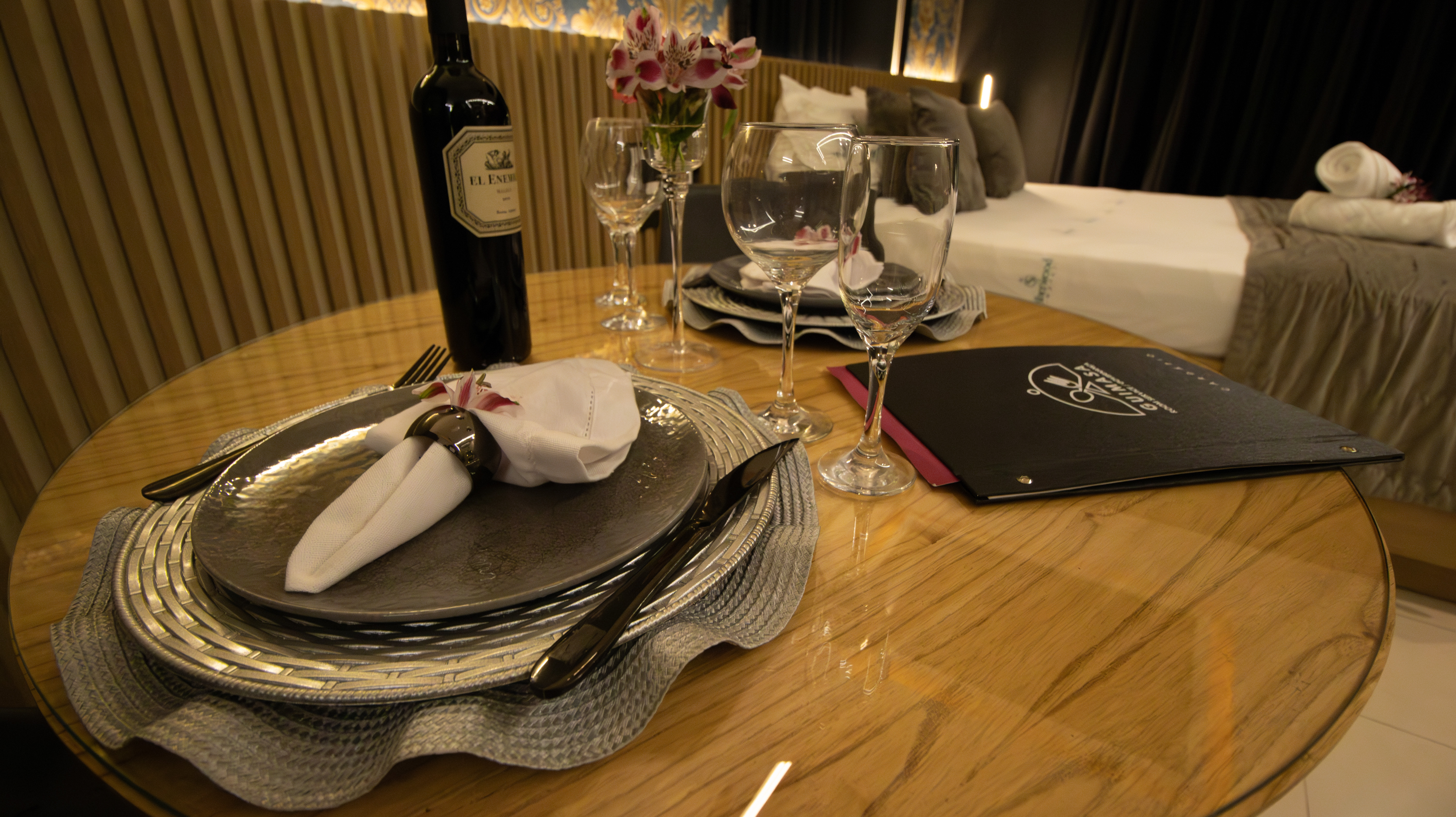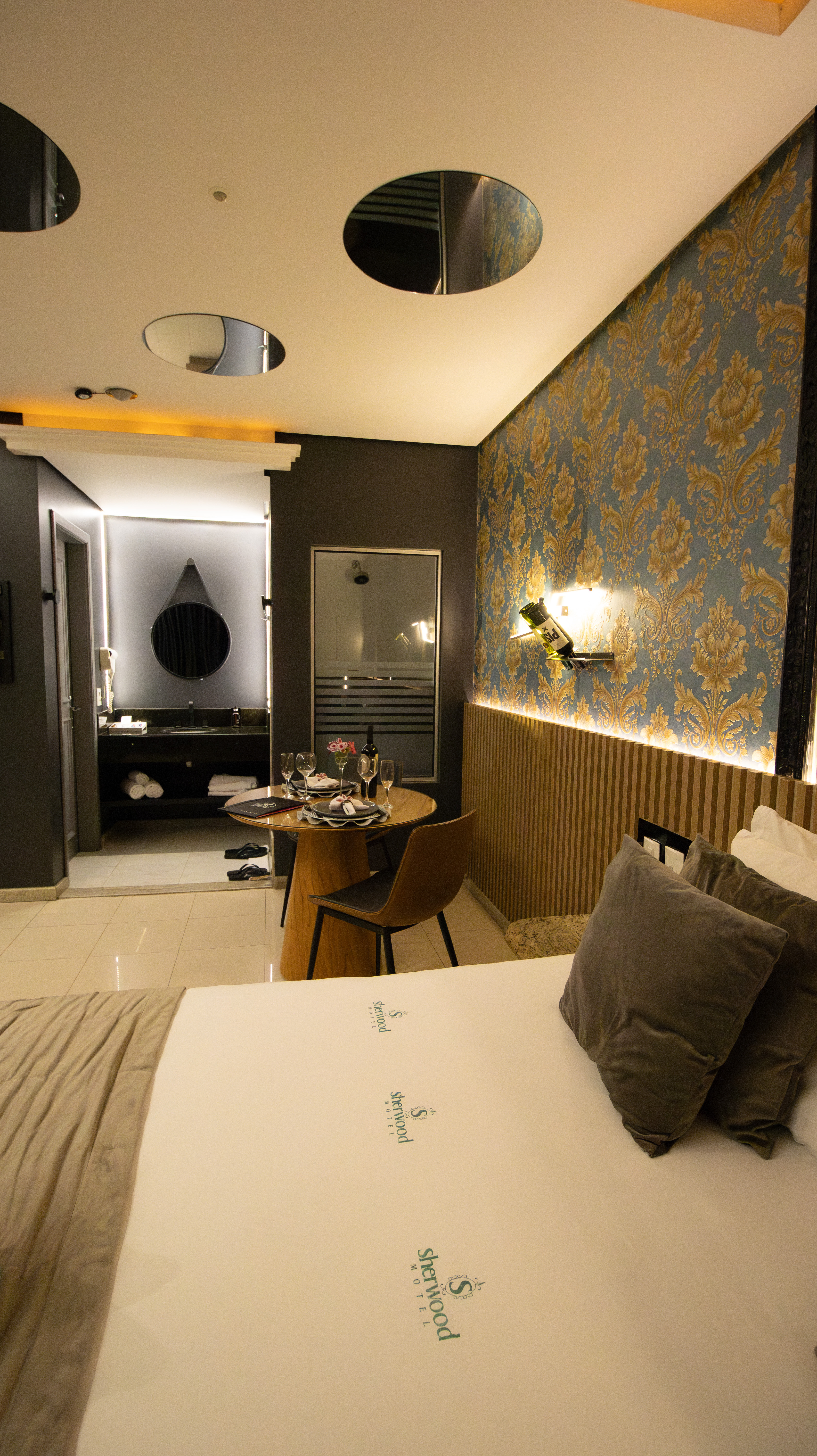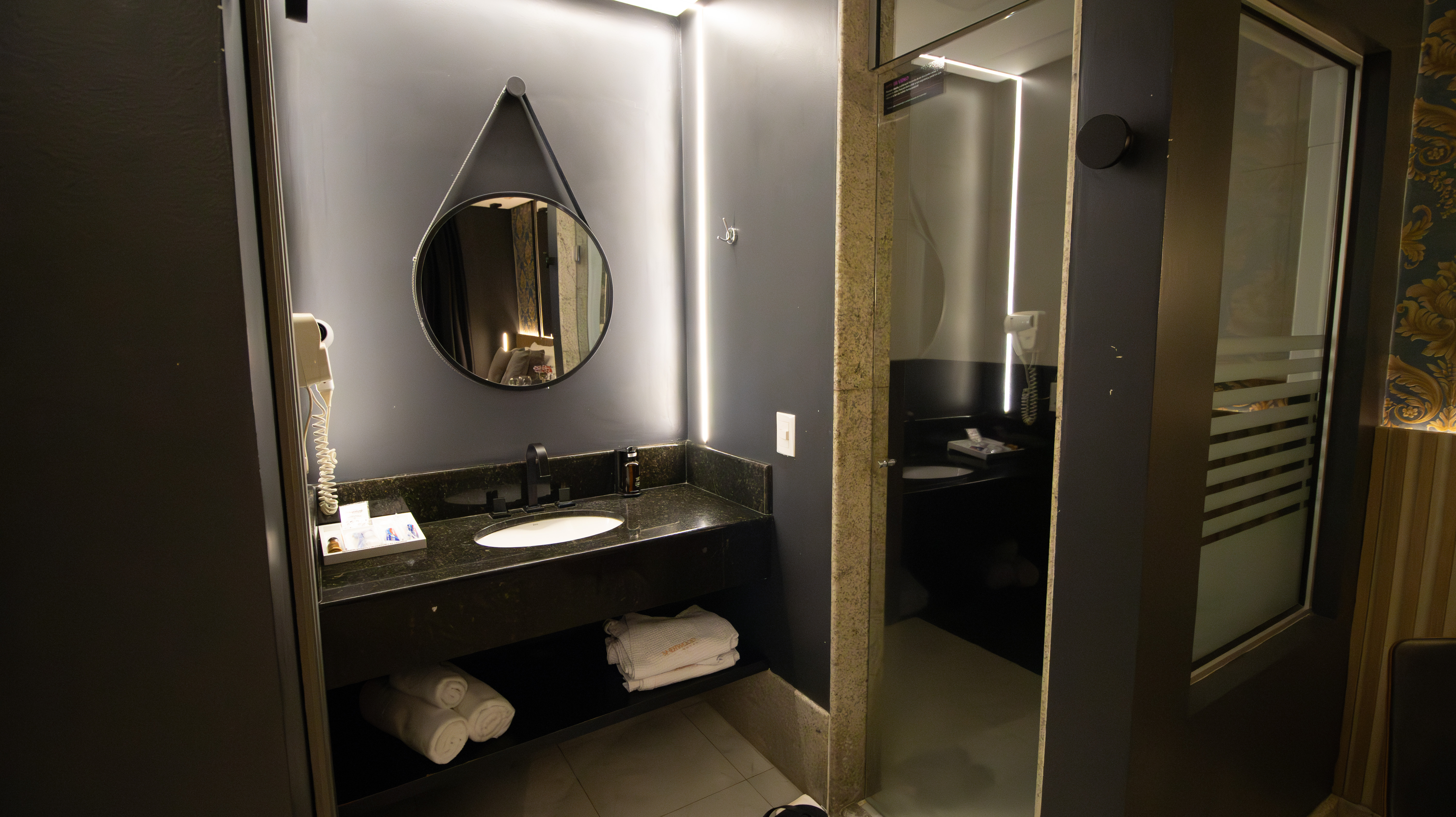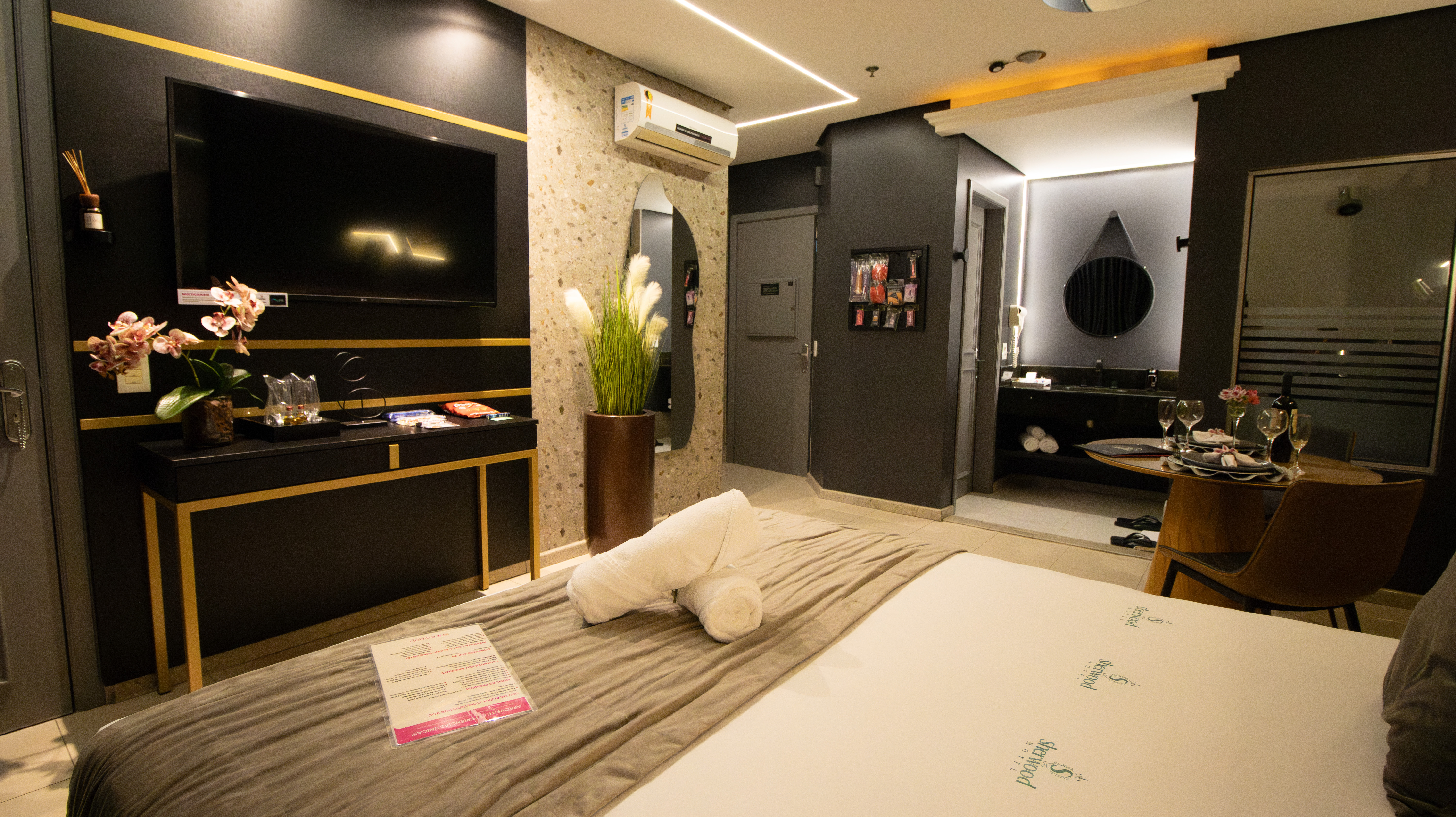 Essa suíte aposta em um ambiente mais envolvente, com iluminação quente e detalhes que trazem charme e aconchego ao espaço. Tudo foi pensado pra criar uma atmosfera mais intimista, perfeita pra relaxar e aproveitar o momento.